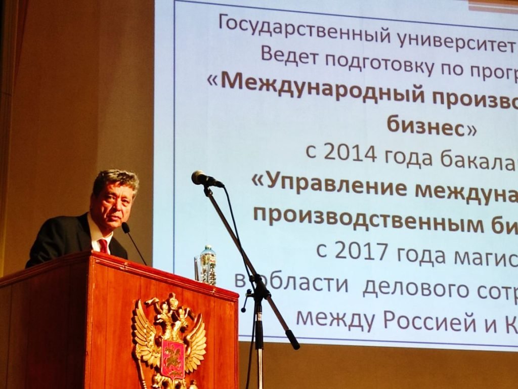 Затем слово взял директор Центра политических и социально-экономических исследований Китая Государственного университета управления Фанис Фалихович Шарипов. Он подробно рассказал о программе «Управление международным производственным бизнесом» и стажировках студентов на реальных китайских предприятиях. Государственный университет управления является одним из первых вузов, в котором уже более 10 лет ведется подготовка специалистов народного хозяйства по российско-китайским программам двойных дипломов.